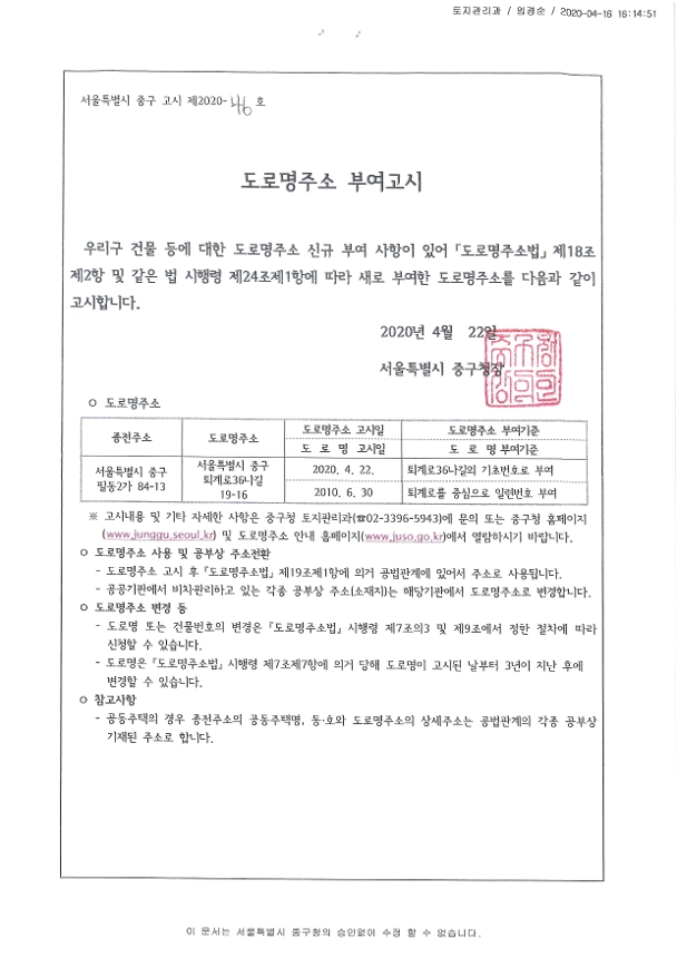| 분류 | 일반공공행정 > 일반행정 > 주소정책 > 도로명주소 부여 및 폐지 고시 | ||