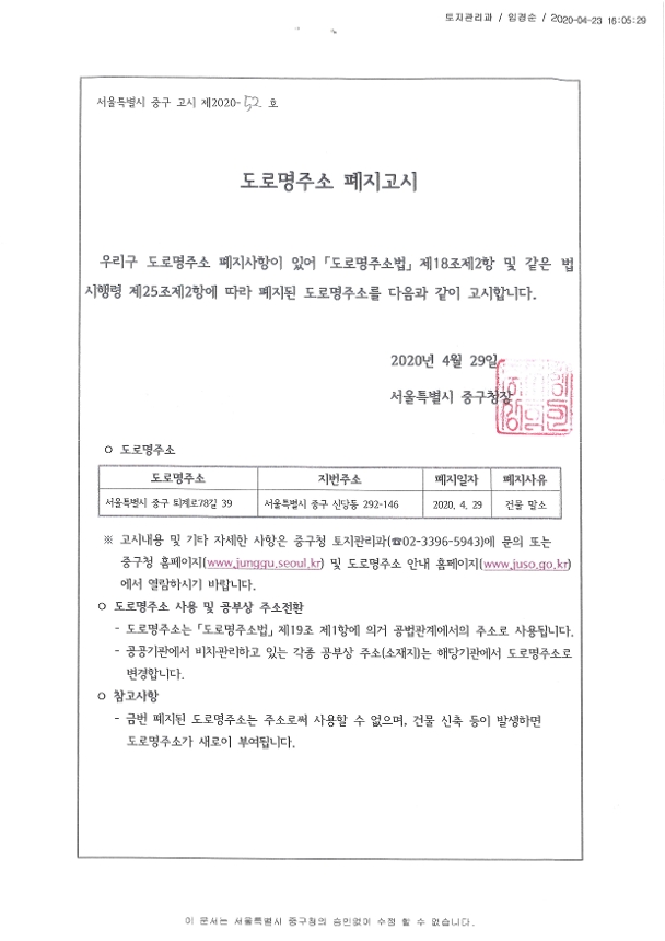 | 분류 | 일반공공행정 > 일반행정 > 주소정책 > 도로명주소 부여 및 폐지 고시 | ||