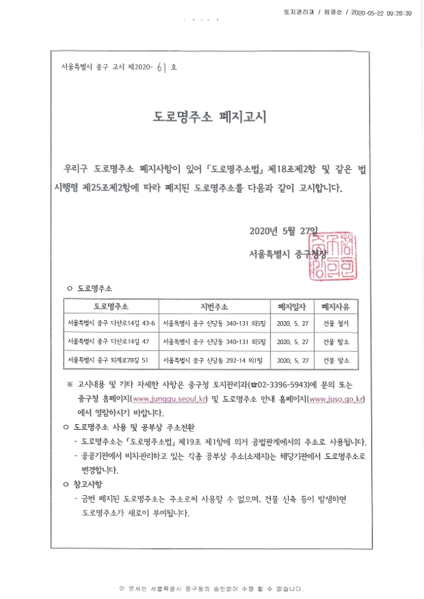 | 분류 | 일반공공행정 > 일반행정 > 주소정책 > 도로명주소 부여 및 폐지 고시 | ||