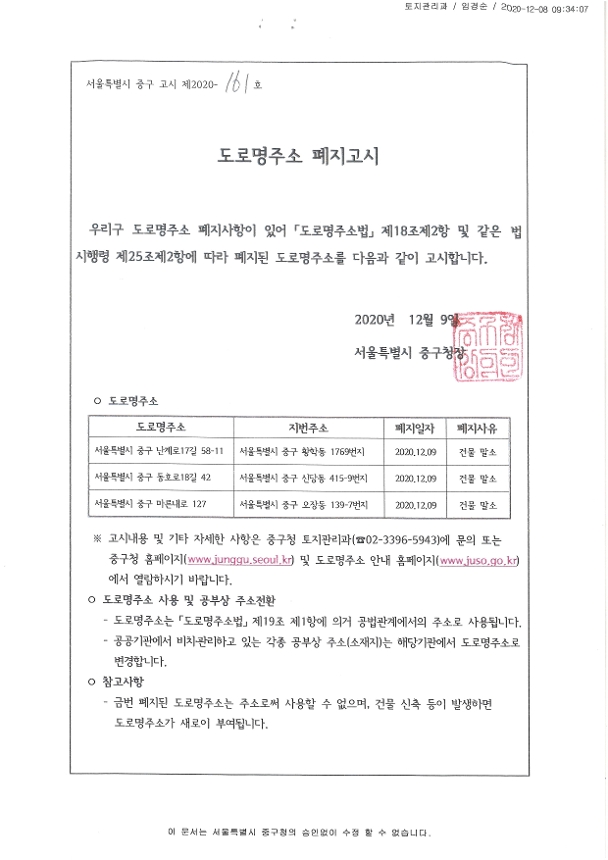 | 분류 | 일반공공행정 > 일반행정 > 주소정책 > 도로명주소 부여 및 폐지 고시 | ||