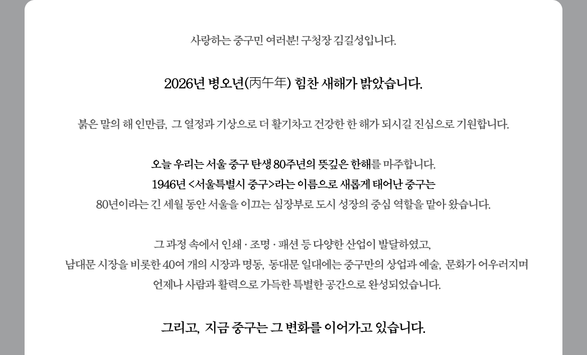 오늘 우리는 서울 중구 탄생 80주년의 뜻깊은 한해를 마주합니다.