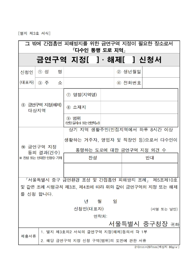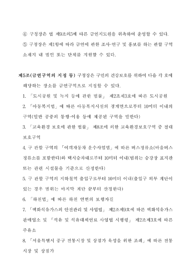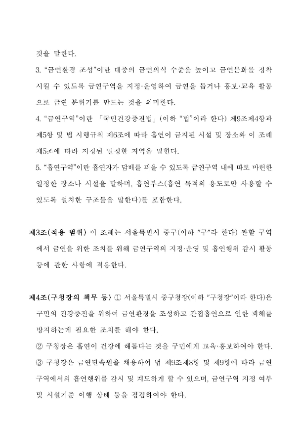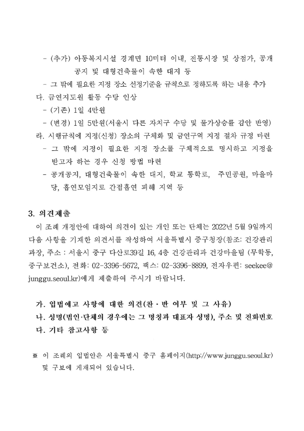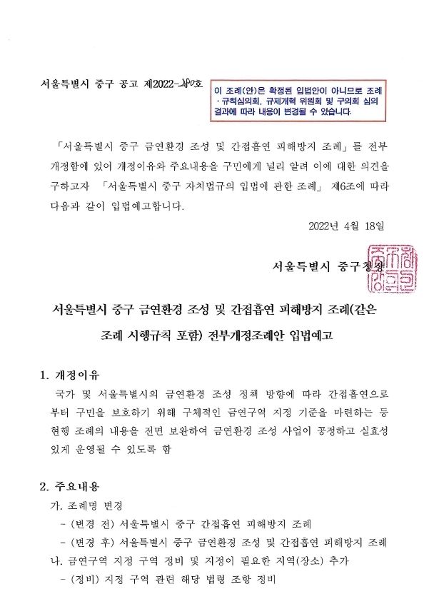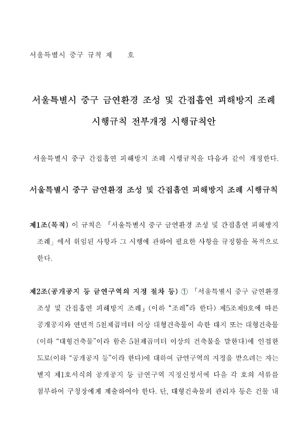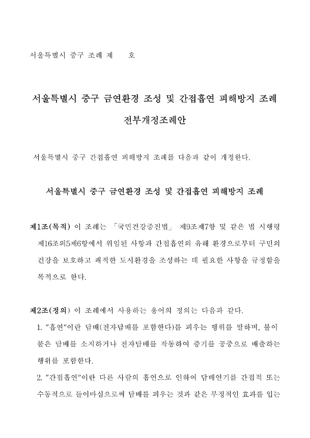 | 서울특별시 중구 금연환경 조성 및 간접흡연 피해방지 조례 전부개정조례안 입법예고 | |||