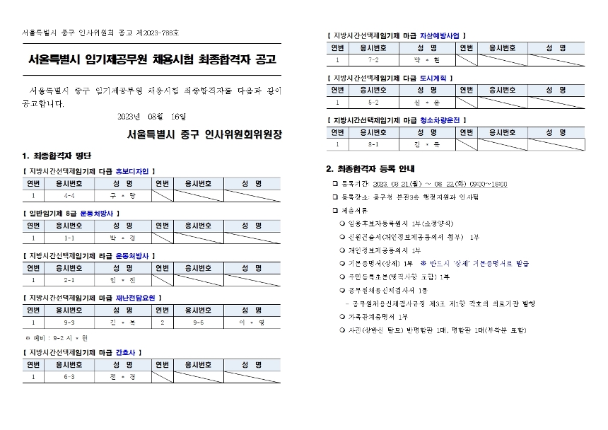 | 서울특별시 중구 임기제공무원 채용시험 최종합격자 공고 | |||
