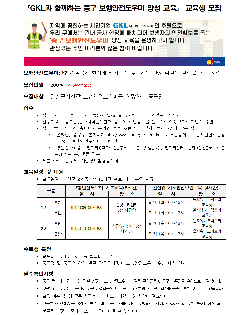 | [일자리] GKL과 함께하는 '중구 보행안전도우미' 양성 교육생 모집 | |||