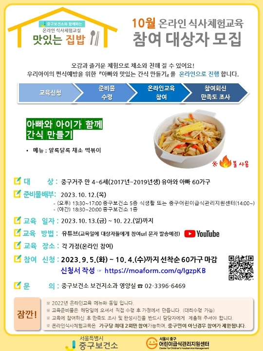 | [마감] 10월 맛있는 집밥[아빠와 아이가 함께 간식 만들기] 온라인식사체험교육 신청 안내 | |||