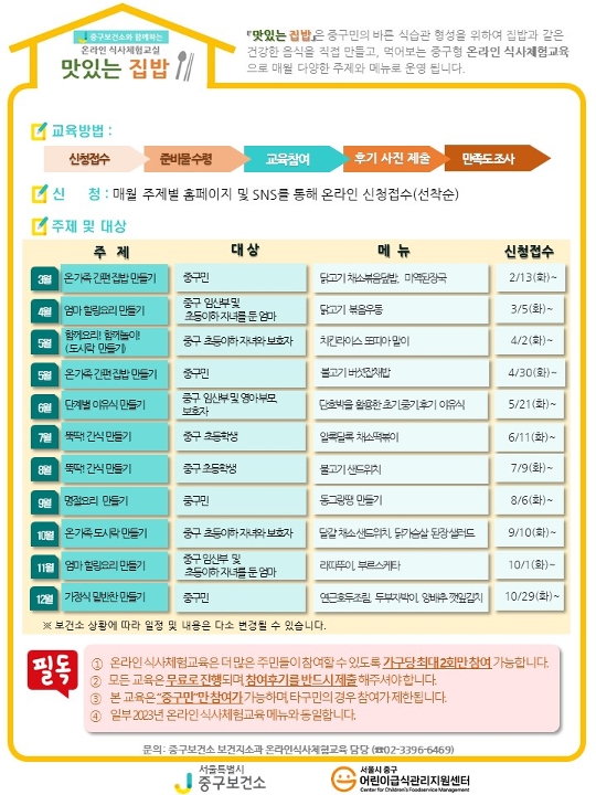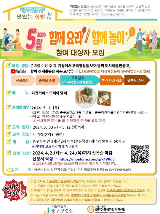 [맛있는 집밥]은 중구민의 바른 식습관 형성을 위하여 집밥과 같은 건강한 음식을 직접 만들고, 먹어보는 중구형 온라인 식사체험교육입니다. 5월은 중구거주 만 3세~12세(초등학생)이하 자녀와 보호자가 함께 참여하는 [함께 요리! 함께 놀이!]라는 주제로 진행됩니다. 가족들이 함께 도시락을 만들고, 먹으며, 신체활동을 하는 프로그램으로 반드시 자녀와 보호자가 함께 참여하셔야 합니다. 5월 참여를 원하시는 분들은 아래 세부내용을 확인 하신 후 신청해 주세요. ★ 5월 [함께 요리! 함께 놀이! 도시락 만들기] 신청하기 → 선착순 접수가 마감되었습니다. ★ 3월 [맛있는 집밥]온라인식사체험교육 후기 보기 ☞ https://youtu.be/03TJJOgBu_0 더 많은 후기는 유튜브 “중구보건소 영양”을 검색하신 후 보실 수 있습니다. ![]()