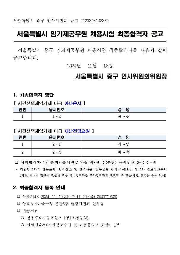 | 서울특별시 중구 임기제공무원 채용시험 최종합격자 공고(아나운서, 재난전담) | |||