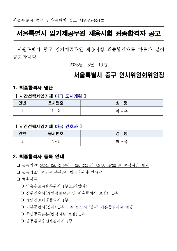 | 서울특별시 중구 임기제공무원 채용시험 최종합격자 공고 | |||