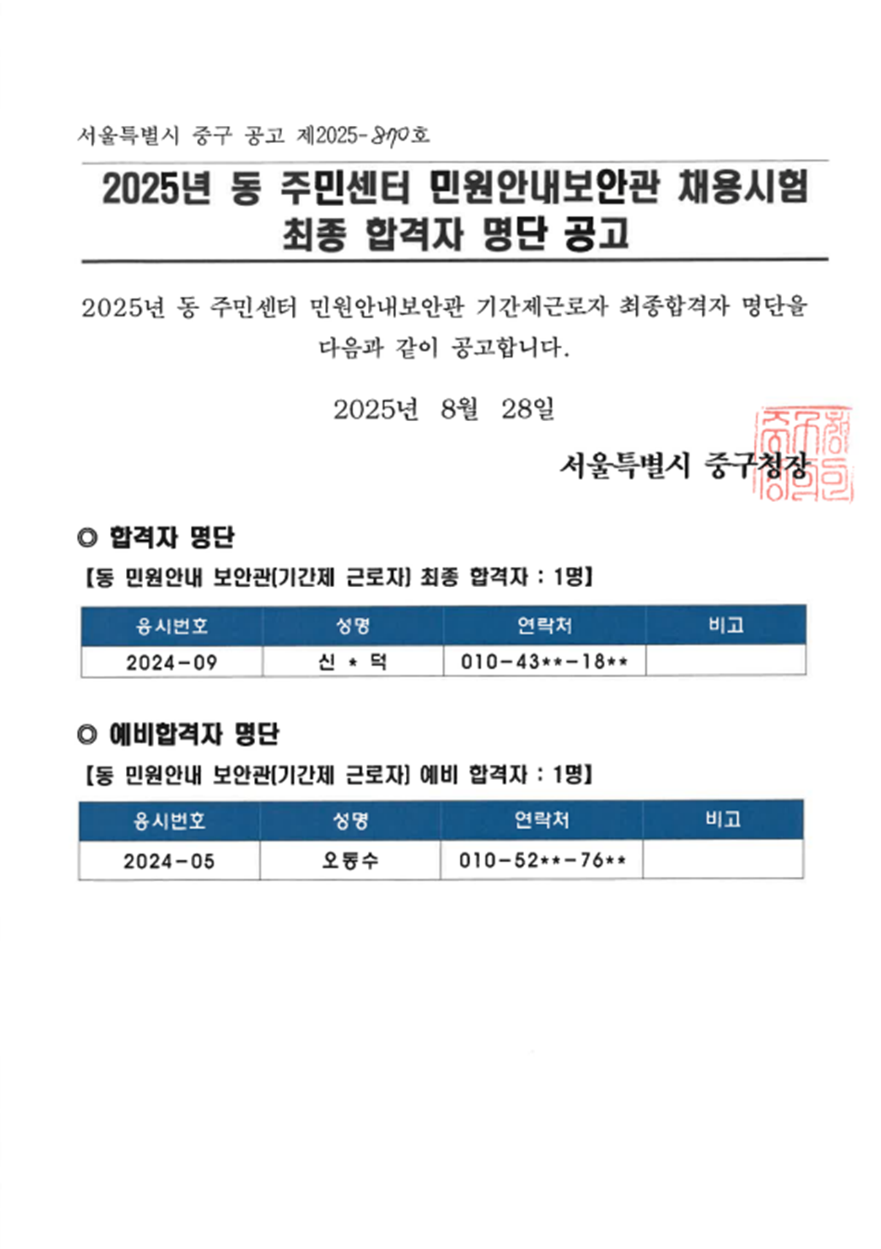 | 2025년 동 민원안내보안관 기간제근로자 최종합격자 발표 | |||