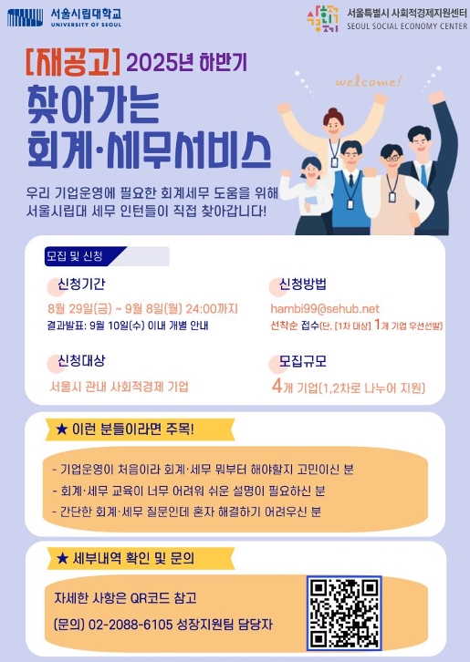 [재공고] (2025년 하반기) 사회적경제 ‘찾아가는 회계세무 서비스’ 참여기업 모집 안내입니다. 어려운 회계세무 [??] 는 이제 그만! 서울시립대 세무인턴이 기업을 직접 방문해서 쉬운 언어로 기업의 고민을 상담하고 교육합니다. [??] 교육·상담 안내 [??] ? 대상: 서울시 관내 사회적경제 기업(서울시 사회적경제 기본조례 제3조 제2항 참조) ※ 추천 대상 : 초기 설립 기업 / 상담이 필요한 회계&세무 고충을 가진 기업 ? 지원기간 : 25년 9~12월 중 기업당 3~5회 ? 지원내용 : ? 세무인턴이 기업 방문하여 고충 수렴 ? 기업의 눈높이에 맞는 쉬운 언어로 회계·세무 교육·상담 제공 ? 현직 멘토단의 자문을 통한 기업의 회계·세무 문제 맞춤 해결 지원 ? 참가비 : 무료 [??] 모집 안내 [??] ? 모집 기간 : 8월 29일(금) ~ 9월 8일(월) 24:00까지 ? 모집 규모 : 총 4개 기업 추가선발 ? 신청 방법 : 신청서류 작성 후, 이메일 접수(hambi99@sehub.net) ? 하반기 지원기업 수 : 총 6개 기업 (1,2차로 나누어 지원) 1차) 3개 기업 대상 / 9월 중순~10월 말 진행 2차) 3개 기업 대상 / 11월 초~12월 중순 진행 ? 선정기준: 선착순 접수(단, [1차 대상] 1개 기업 우선선발. 나머지 3개 기업은 2차 지원 대상) 후 신청서류 적격/부적격 담당자 확인 ? 선정안내 : 9월 10일(수) 이내 개별 안내 ※ 이메일 또는 휴대폰으로 안내 [??] 문의 : 서울특별시사회적경제지원센터 성장지원팀 02-2088-6105 / hambi99@sehub.net (붙임) [재공고] 2025년 하반기 찾아가는 회계·세무 서비스 참여기업 신청서(양식) 1부 ☆ 세무인턴제란? 서울시립대 세무학과 학생 중 전문적인 자격을 갖춘 학생들로 조를 편성하여 세무인턴으로 기업 방문하여 현장 교육 및 상담을 진행하고, 조별로 현직 회계사/세무사가 배정되어 멘토링을 통한 세무인턴의 전문성 증대