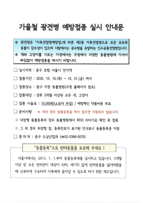 | 2025년 가을철 광견병 예방접종 실시 안내 | |||