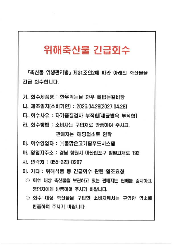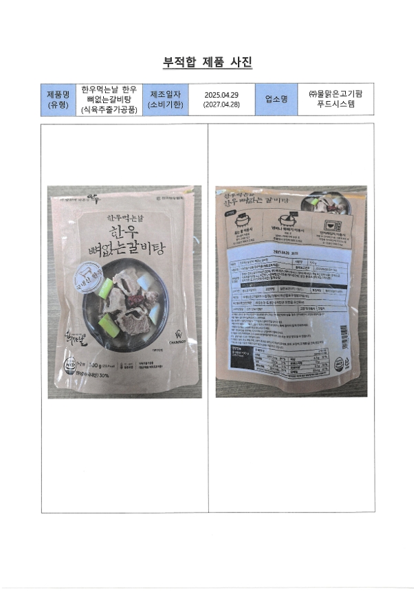 위해축산물 긴급회수(한우먹는날 한우 뼈없는 갈비탕) | |||