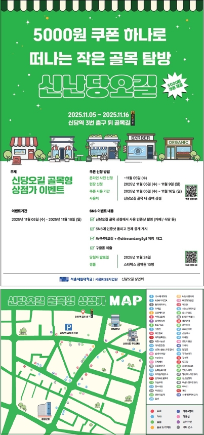 · 행 사 명 : 2025 신난당오길 · 내 용 : 신당오길 골목상권 내 가맹점에서 사용 가능한 쿠폰 지급 · 일 시 : 2025. 11. 5.(수) ~ 11. 16.(일) - 쿠폰 배포 기간: 2025. 11. 5.(수) ~ 11. 9.(일) 10:00-16:30 (오시여호프 앞) - 쿠폰 사용 기한: 2025. 11. 5.(수) ~ 11. 16.(일)