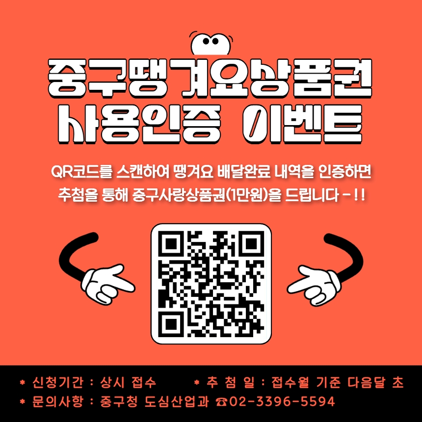 ○ 참여기간 : 상시 접수 ○ 참여조건 : 신청기간 중 '땡겨요' 앱에서 '중구땡겨요상품권'으로 결제 후 배달 주문 ○ 추 첨 일 : 접수일 기준 다음달 초 일괄 추첨 ex. 11월 접수 → 12월 초 추첨 ○ 경 품 : 중구사랑상품권 1만원 ( ※ 지급횟수 : 1인당 총 3회로 제한) ○ 참여방법 1. 배달 주문하기 - ‘땡겨요’ 앱에서 결제수단 ‘중구땡겨요상품권’ 선택 후 배달 주문 2. 배달 완료된 내역 캡쳐하기 - '땡겨요' 앱 접속 → 주문내역 → 주문상세 - 상단의 “배달완료” 문구부터 하단의 “서울Pay+ 00,000원”까지 화면이 보이도록 전체 캡쳐 ※ ‘주문완료’, ‘배달 중’ 상태는 참여 불가 (반드시 배달완료 건이어야 함) 3. 네이버폼 접속하기 - 포스터 클릭, 포스터 QR코드 스캔, 또는 참여링크(https://naver.me/xcAhFuqP) 접속 4. 네이버폼 제출하기 - 안내에 따라 정보 입력 후 캡쳐사진(인증자료) 첨부하여 제출 ![]() |