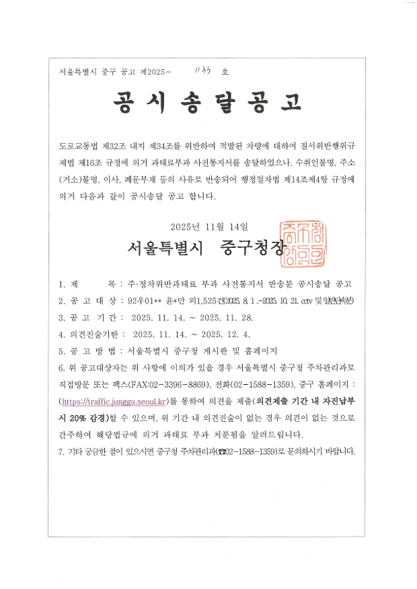 | 주.정차위반 과태료 사전통지서 반송분 공시송달 공고 | |||