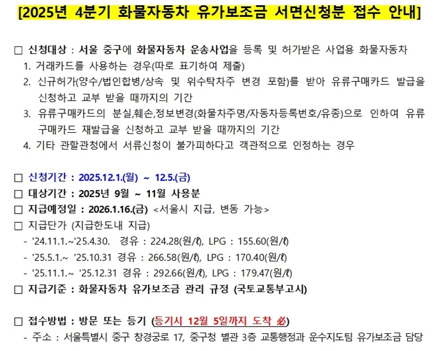 | 2025년 4분기 화물자동차 유가보조금 서면신청분 접수 안내 | |||