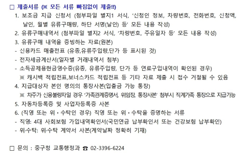 ![]() ![]() [2025년 4분기 화물자동차 유가보조금 서면신청분 접수 안내] □ 신청기간 : 2025.12.1.(월) ~ 12.5.(금) □ 대상기간 : 2025년 9월 ~ 11월 사용분 □ 지급예정일 : 2026.1.16.(금) <서울시 지급, 변동 가능> □ 접수방법 : 방문 또는 등기 (등기시 12월 5일까지 도착 必) - 주소 : 서울특별시 중구 창경궁로 17, 중구청 별관 3층 교통행정과 운수지도팀 유가보조금 담당 □ 문의 : 중구청 교통행정과 ☎ 02-3396-6224 □ 상세내용 : 붙임 참조 |