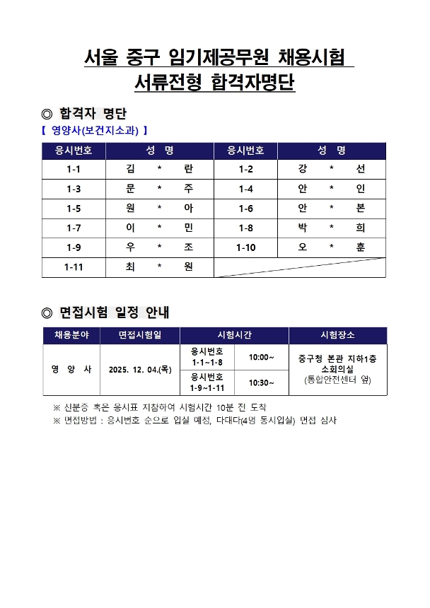 | 서울특별시 중구 임기제공무원 채용시험 서류전형합격자 공고(영양사) | |||