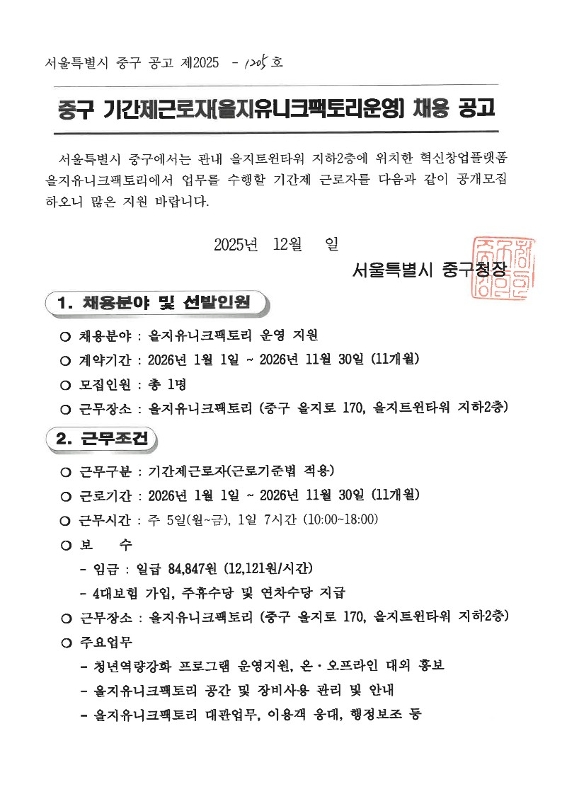 | 2026년 을지유니크팩토리 기간제근로자 채용 공고 | |||