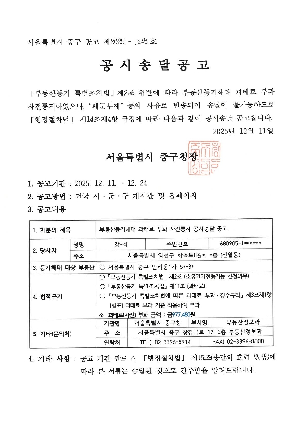 | 부동산등기해태 과태료 부과 사전통지 공시송달 공고 | |||