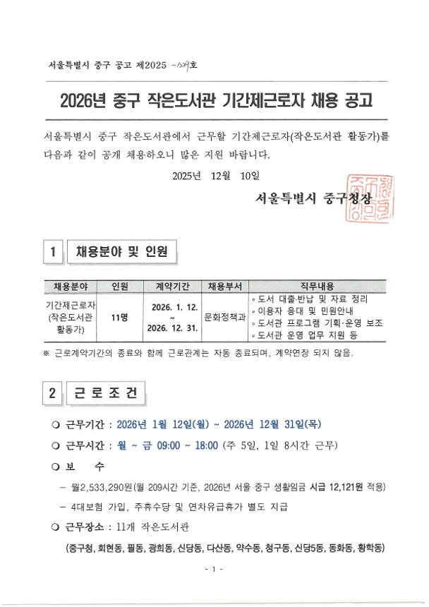 | 2026년 중구 작은도서관 기간제근로자 채용 공고 | |||