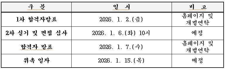재단법인 중구문화재단 사장 1. 모집분야 및 인원 : 지휘자 1명 2. 응시자격 가. 4년제 대학이상에서 음악(실용음악 포함)을 전공하여 학사 학위이상을 취득 한 자 또는 이와 동등한 자격을 취득한 자 나. 국·내외 합창단 지휘경력, 노래교실 경력이 풍부한 자 다. 주2회(매주 화요일,금요일 10:00 ~ 12:30) 이상 음악지도 가능한 자 라. 구에서 실시하는 각종 공연 및 행사 시 지휘 가능한 자 마. 남자의 경우 병역법에 의한 병역을 필한 자 또는 면제자(해당자 한함) 3. 위촉기간 : 1년 (최초계약 1년 활동실적평가 이후 재위촉 가능) 4. 보수 : 중구문화재단 구립예술단체 지원내규에 의거 5. 제출서류 - 지원서, 자기소개서, 운영계획서 등 1부 (이메일 제출) - 최종학교 졸업증명서 1부(합격시 제출) 6. 응시서류 접수 가. 접수기간 : 2025. 12. 11.(목)~2025. 12. 24.(수) 09:00~18:00 나. 지원서 다운로드 : 충무아트센터 홈페이지(www.caci.or.kr)에서 다운로드 후 작성 다. 접수방법 : 이메일 접수 ※ 이메일 접수시 파일명을 “(합창단 지휘지원)-지원자 성명”으로 표기 바랍니다. 라. 접수이메일 : wisdomcaci@naver.com 7. 전형방법 및 전형일정 가. 1차 서류심사 나. 2차 면접 및 실기심사 : 1차 서류전형 합격자에 한함 - 2차 실기평가 지정곡 中 택1 가능 ![]() ※ 2차시험 당일 지원자별 가요합창단과의 연습시간 15분 부여, 5분 실연 ※ 악보는 저작권으로 인해 악보구입처에서 개인 구입 후 지참 바람 다. 전형일정 ![]() 8. 기타사항 가. 제출된 서류는 반환되지 않습니다. 나. 제출된 서류내용이 허위로 판명되었거나 결격사유 발생 시에는 합격을 취소합니다. 다. 경력기준은 해당분야에 관한 실무경력만 인정합니다. 라. 1차 서류심사 합격자에 한하여 면접시험 일정을 홈페이지 및 개별 통보합니다. 마. 심사결과는 공개하지 않습니다. 바. 기타 자세한 사항은 재단법인 중구문화재단 문화사업팀(02-2230-6736)으로 문의하시기 바랍니다. |