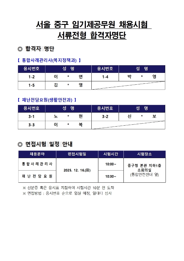 | 서울특별시 중구 임기제공무원 채용시험 서류전형합격자 공고(통합사례관리사 및 재난전담요원) | |||