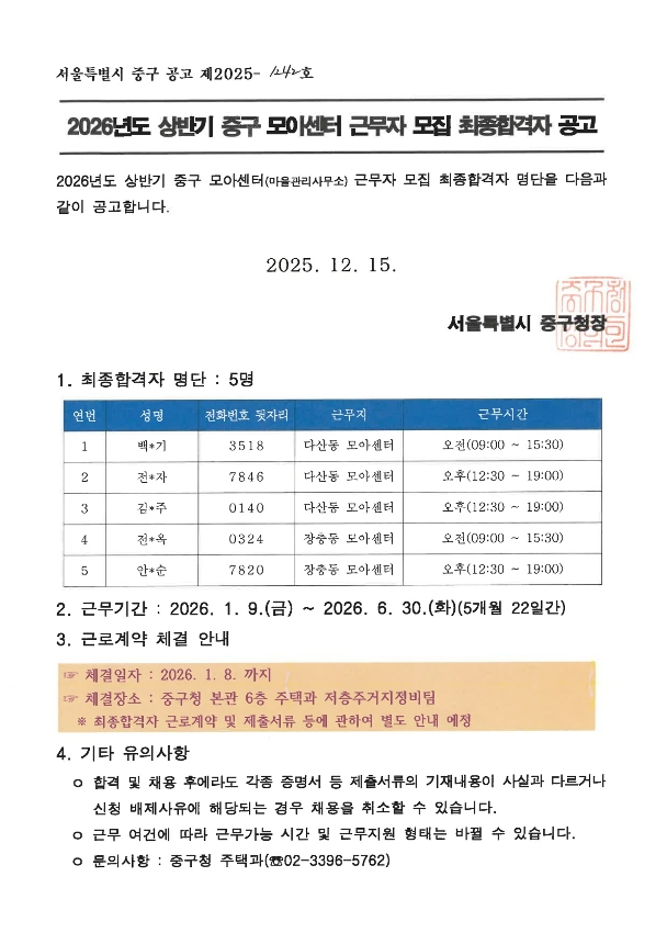 | 2026년도 상반기 중구 모아센터 근무자 모집 최종합격자 공고 | |||