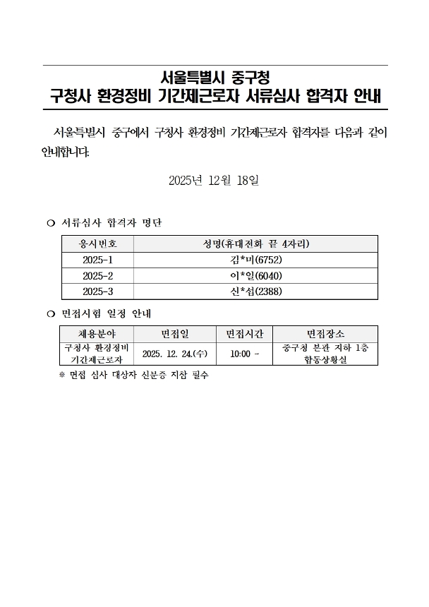 | 2026년 구청사 환경정비 기간제근로자 서류심사 합격명단 및 면접심사 안내 | |||
