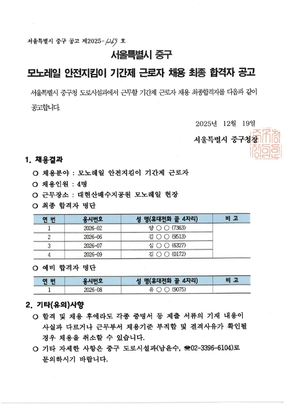 | 대현산배수지공원 모노레일 안전지킴이 채용 최종합격자 공고 | |||