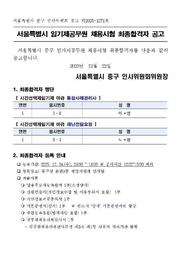| 서울특별시 중구 임기제공무원 최종합격자 발표(재난전담요원, 통합사례관리사) | |||