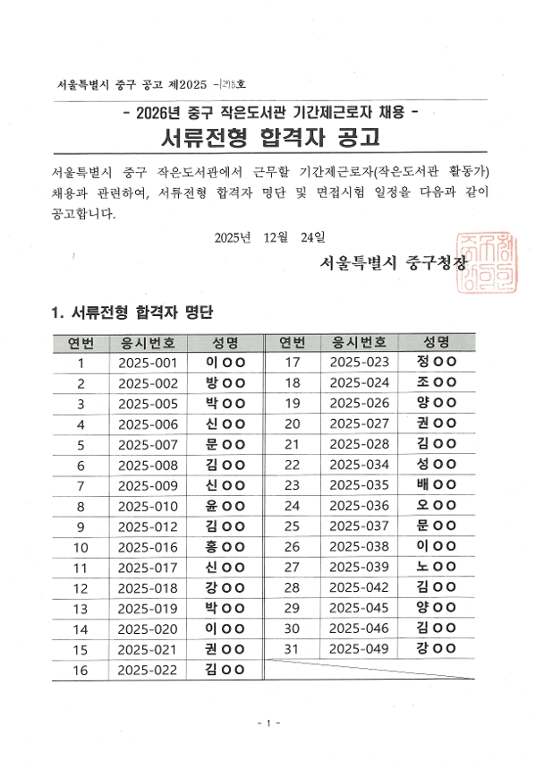 | 2026년 중구 작은도서관 기간제근로자 채용 서류전형 합격자 공고 | |||