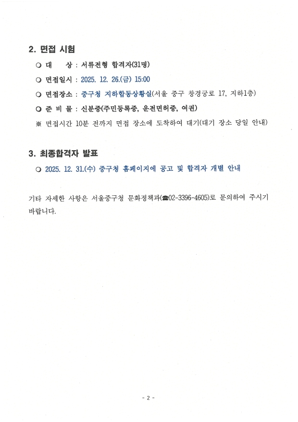 | 다음글 | 2026년 서울특별시 중구 공원녹지분야 기간제근로자 공개채용 2차(서류·실기)심사 합격자 및 공개추첨 계획 공고 |