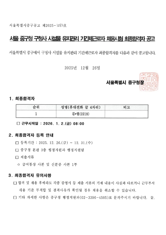 | 기간제근로자(구청사 시설물 유지관리) 채용시험 최종 합격자 공 | |||