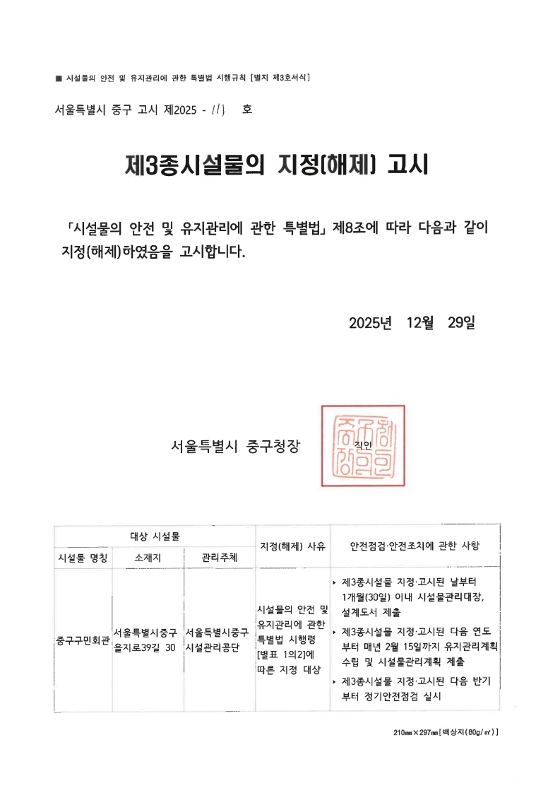 서울시중구청 (우)04558 서울시 중구 창경궁로17 (예관동)