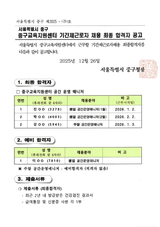 | 중구교육지원센터 2026년 기간제근로자 채용 최종합격자 공고 | |||