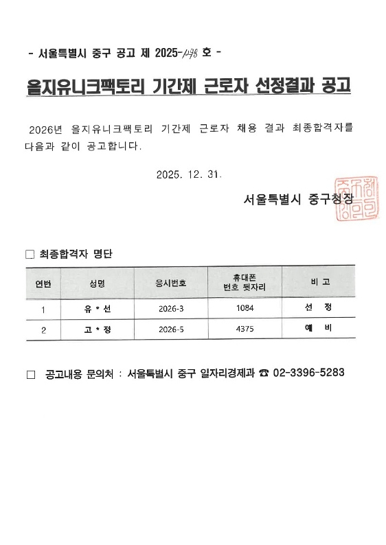| 2026년 을지유니크팩토리 기간제 근로자 선정결과 공고 | |||