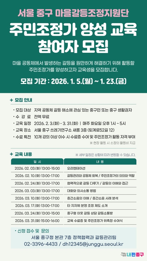 ![]() 마을 공동체에서 발생하는 갈등을 원만하게 해결하기 위해 활동할 주민조정가를 양성하고자 다음과 같이 교육생을 모집하오니 관심 있는 주민 여러분의 많은 신청 바랍니다. 1. 교육 개요 ○ 교 육 명 : 마을갈등조정지원단 주민조정가 양성 교육 ○ 교육 기간 : 2026. 2. 3.(화) ~ 3. 31.(화) (매주 화요일, 총 24시간) ※ 세부 일정 및 내용은 상단 이미지 및 붙임 파일 참고 ○ 교육 장소 : 쓰레기연구소 새롬 3층 교육장 (서울 중구 퇴계로52길 12) ○ 교 육 비 : 전액 무료 ○ 교육 수료 : 전체 12강 중 10개 강의 이상 이수자 - 수료 시 서울특별시 중구 마을갈등조정지원단 주민조정가로 위촉 ○ 주민조정가 활동 내용 - 갈등 발생 우려가 있는 구 주요 사업에 대한 주민 의견 청취 등 지원 - 주민 간 갈등 해소를 위한 당사자 상담 지원 - 그 밖에 공동체 회복 등 공공갈등 예방·해결에 관련한 활동 ○ 주민조정가 활동 수당 : 현장 활동 시 소정의 활동비 지급 2. 교육생 모집 ○ 모집 기간 : 2026. 1. 5.(월) ~ 1. 23.(금) ○ 모집 인원 : 20명 내외 ○ 신청 자격 - 공고일 기준 중구에 거주하는 주민이거나 중구 생활권자 - 지역 현안 및 갈등 해소에 대한 관심과 활동 의지가 분명한 자 - 교육 수료 후 주민조정가 활동이 가능한 자 ○ 제출 서류 - 주민조정가 양성 교육 참여 신청서 (개인정보 수집·이용 제공 동의 포함) ※ 신청서 서식은 붙임 파일 다운로드 ○ 제출 방법 : 이메일 또는 방문 제출 - 이메일 : dh12345@junggu.seoul.kr - 방 문 : 서울특별시 중구청 7층 정책협력과 (서울 중구 창경궁로 17) 3. 선정 방법 및 결과 발표 ○ 선정 방법 : 제출 서류 검토 후 교육생 선정 ○ 고려 사항 - 신청서 내 지원 동기 및 활동 열의 - 주민자치위원회, 통·반장, 입주자대표회의 등 지역 사회 활동 이력 - 평일 주간 시간대(09:00~18:00) 중 활동 가능 여부 ○ 교육생 발표 : 2026. 1. 28.(수) 예정 ※개별 유선 통보 및 문자 발송 4. 기타 사항 ○ 기재된 내용이 사실과 다른 경우 교육생 선정을 취소할 수 있습니다. ○ 기타 문의는 중구청 정책협력과 갈등관리팀(☎02-3396-4433)으로 바랍니다. |