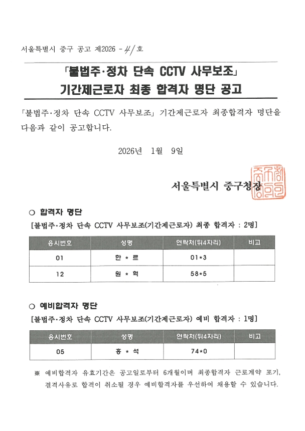 | 불법주,정차 단속 cctv 사무보조 기간제근로자 최종합격자 명단 | |||