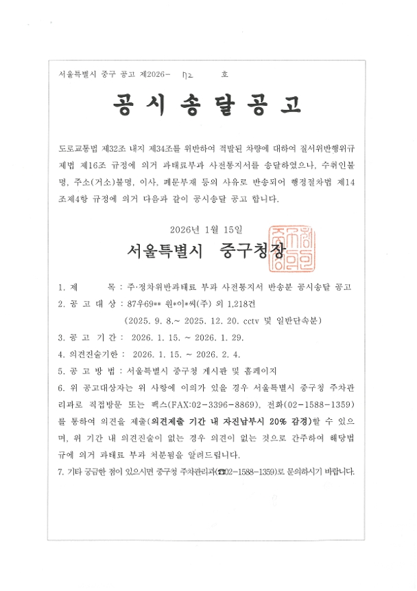 | 주.정차위반 과태료 사전통지서 반송분 공시송달 공고 | |||