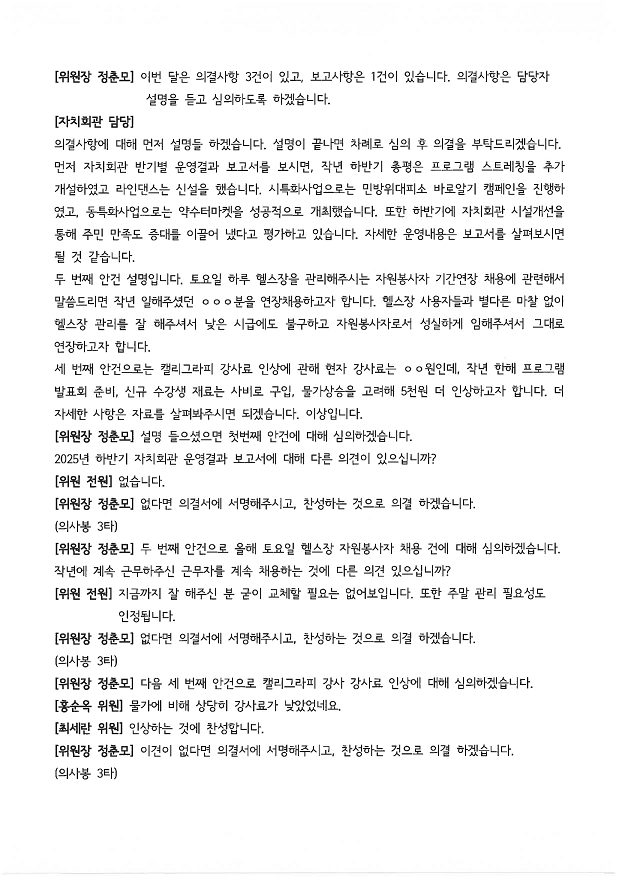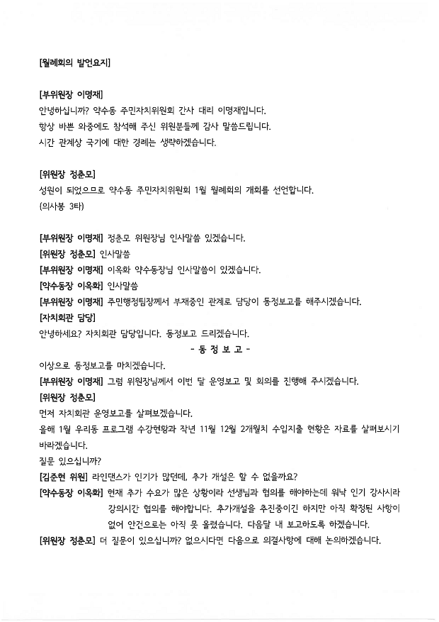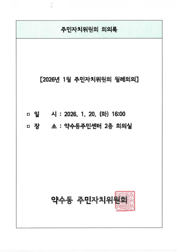 | 회의제목 | 2026년 1월 약수동 주민자치위원회 월례회의 회의록 공개 | ||