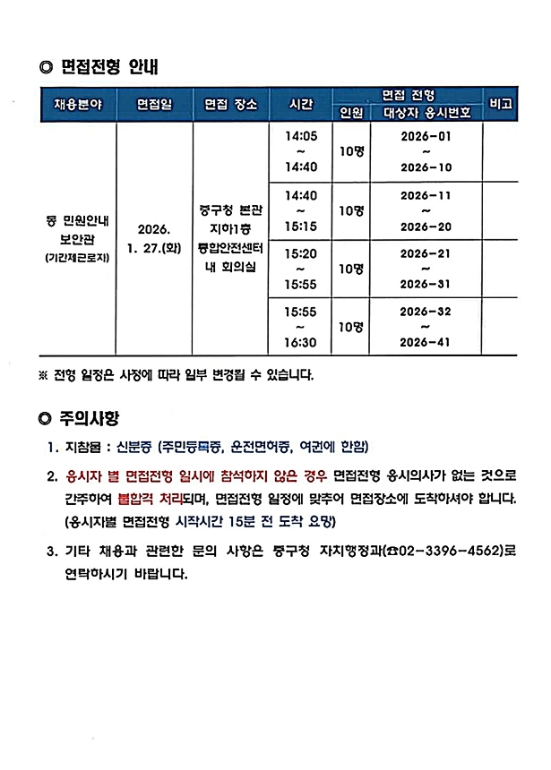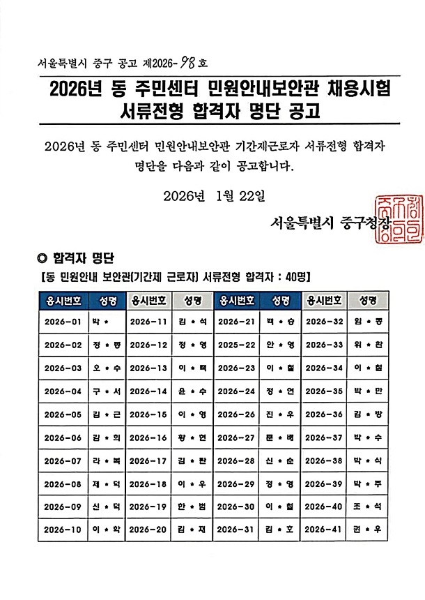 | 2026년 동 민원안내보안관 기간제근로자 서류전형 결과 공고 | |||