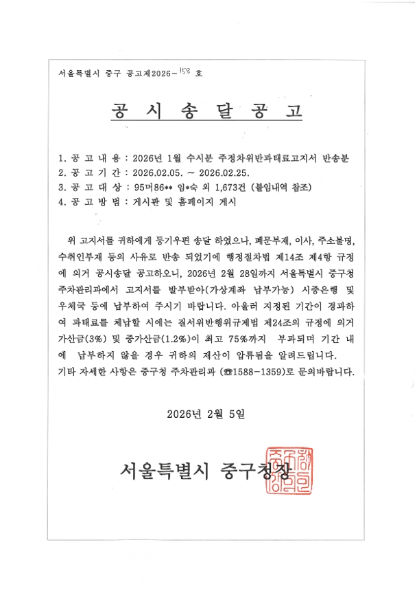 | 주정차위반과태료 수시(2026년 1월부과) 반송분 공시송달 | |||