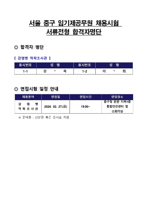 | 서울특별시 중구 임기제공무원 채용시험 서류전형합격자 공고(감염병 역학조사관) | |||