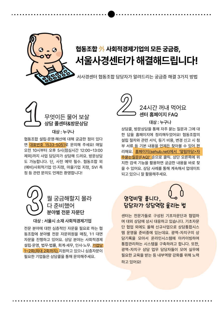 | 사회적경제 기업 상담 운영 안내 (☎ 1533-5051) | |||