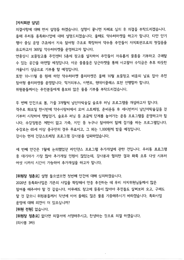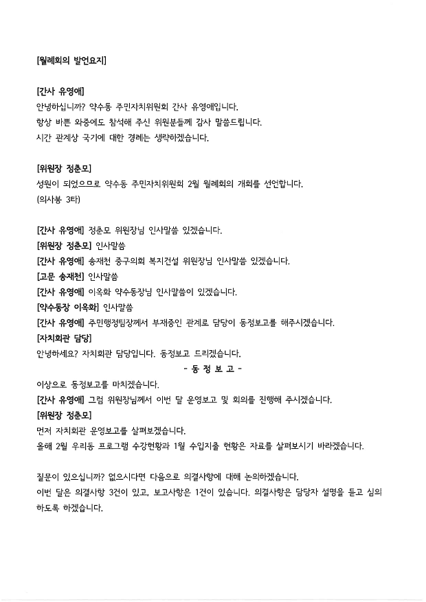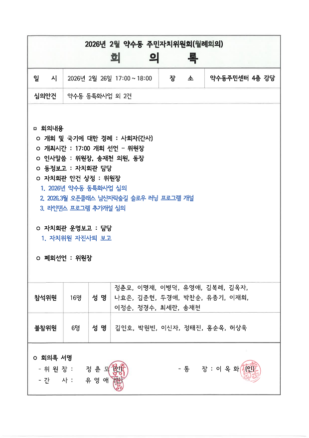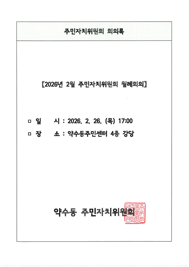 | 회의제목 | 2026년 2월 약수동 주민자치위원회 월례회의 회의록 공개 | ||