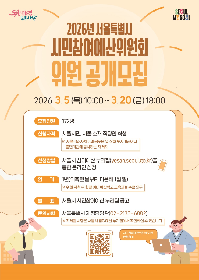 2026년 서울시 시민참여예산위원회 위원을 공개모집하오니 관심있는 주민분들의 많은 신청 바랍니다:)
