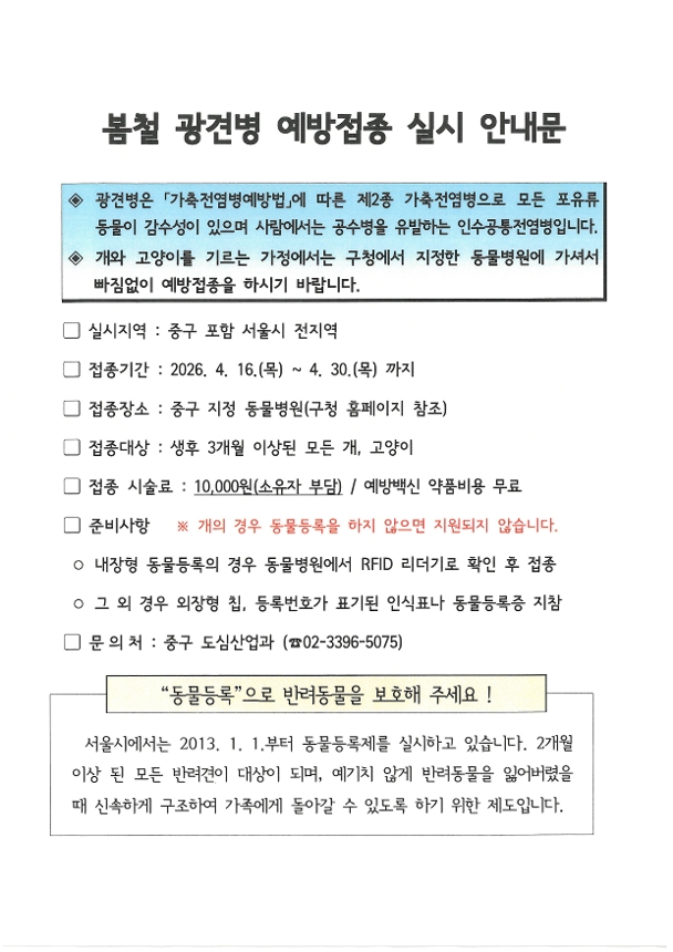 | 2026년 봄철 광견병 예방접종 실시 안내 | |||