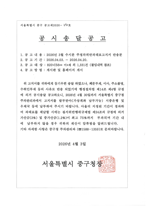 | 주정차위반과태료 수시(2026년03월부과) 반송분 공시송달 | |||