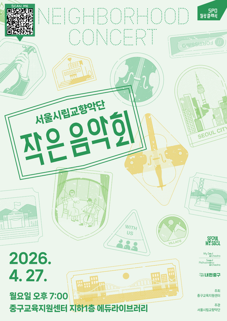 작지만 깊은 울림을 전하는 따뜻한 클래식 음악회에 여러분을 초대합니다 * 일시 : 2026. 4. 27.(월) 19:00~20:00 * 장소 : 중구교육지원센터 지하1층 에듀라이브러리 * 내용 : 해설이 있는 클래식 음악 공연 * 신청 : 초등학생 가족 ☞ https://edu.junggu.seoul.kr/eroum/selectCnterProgrmWebView.do?key=119&cnterProgrmNo=1692 중학생 이상 성인 ☞ https://edu.junggu.seoul.kr/eroum/selectCnterProgrmWebView.do?key=119&cnterProgrmNo=1695 ![]() 바쁜 일상 속, 음악으로 잠시 쉬어가는 시간~ 중구교육지원센터에서 함께해 보세요!!! |